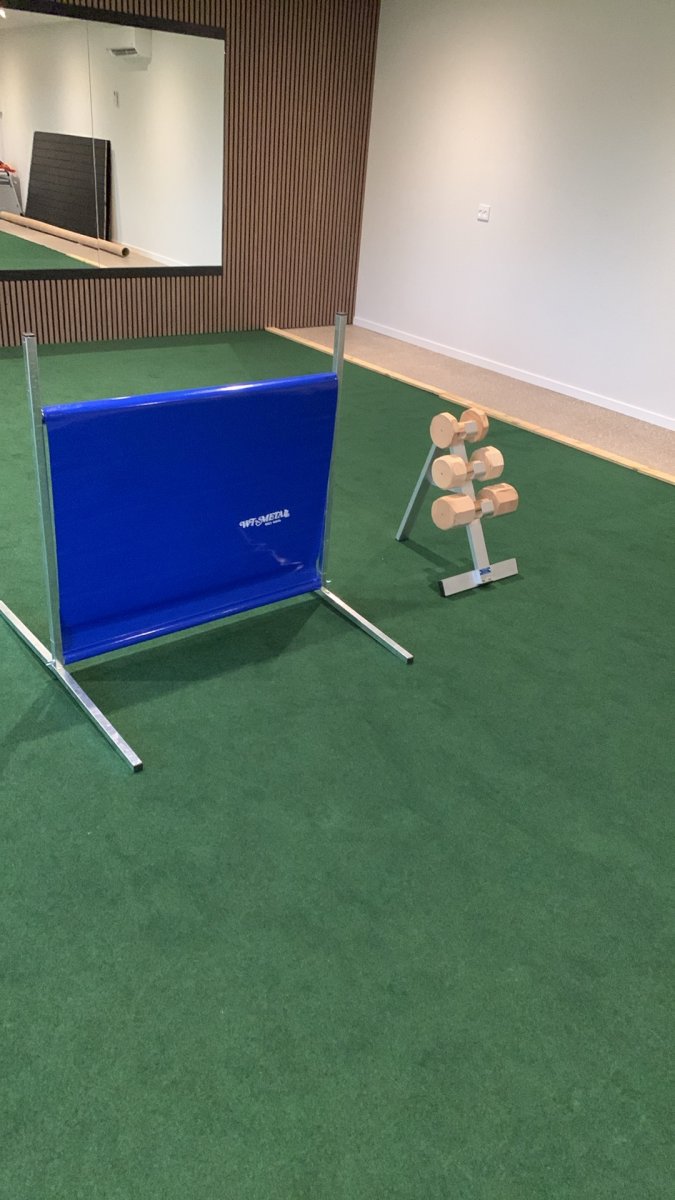 Endelig er vi kommet i mål med etablering af vores lille hundetræningshal - med tæppe, spejlvæg, spring mm.